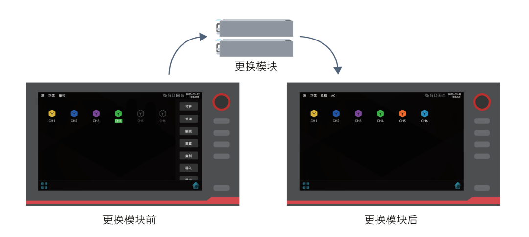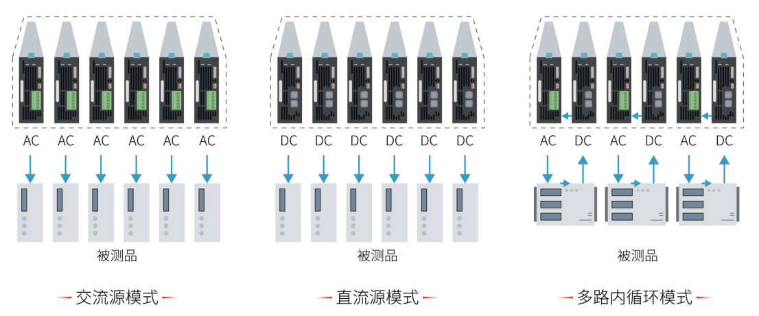 混合多通道设计,交直模块灵活选择:3U体积内6通道混合接口设计,可自主配置AC、DC模块,插拔式安装便捷,可满足AC/AC、AC/DC、DC/AC和DC/DC常见拓扑测试。