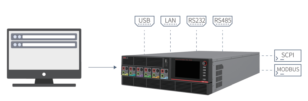 内置USB、LAN、选配RS232/RS485多种通信接口,支持SCPI/MODBUS命令集,便于集成至自动化测试系统中,实现远程控制与监控。